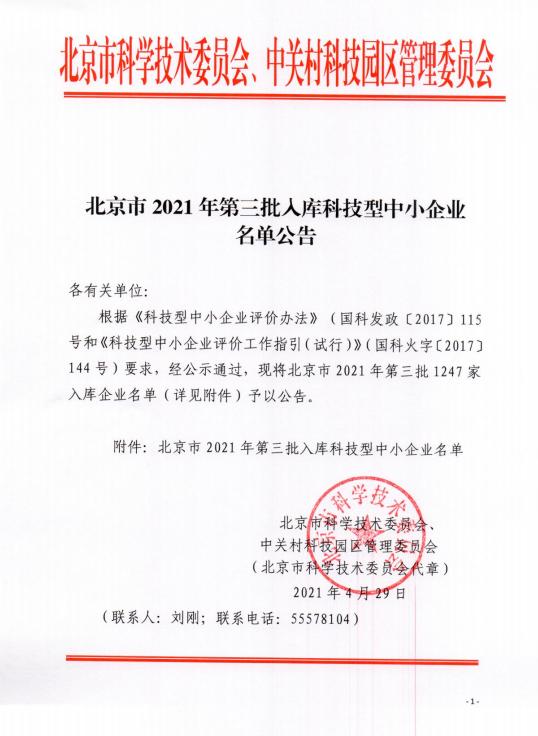 近日,北京市科學(xué)技術(shù)委員會公示2021年第三批入庫科技型中小企業(yè)公示名單,我公司繼2018年被認(rèn)定為“北京市科技型中小企業(yè)”和2019年第一批入庫科技型中小企業(yè),再次獲此稱號,這是我公司研究開發(fā)服務(wù)取得的又一喜人成果,是我公司走向科技型企業(yè)發(fā)展的一個巨大突破,更是有關(guān)政府部門對我司研發(fā)和技術(shù)服務(wù)的充分認(rèn)可。
