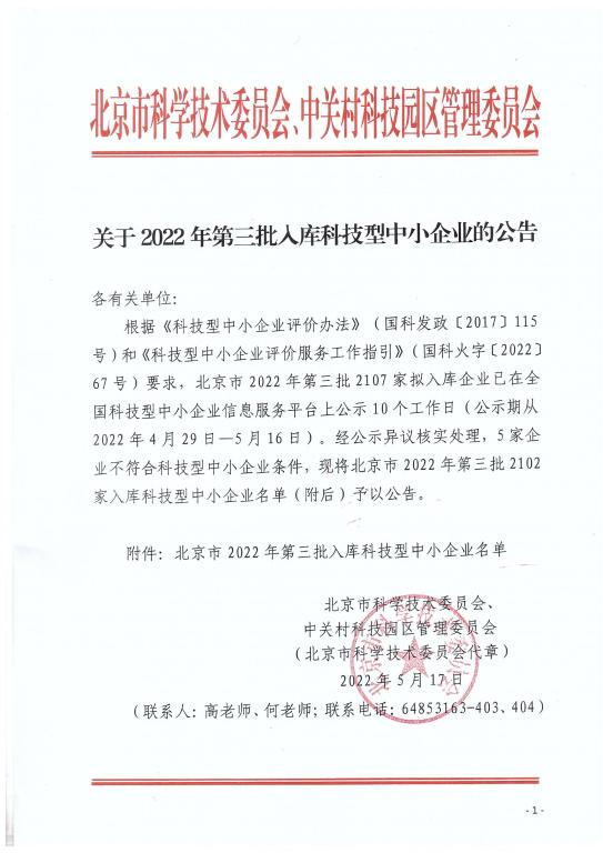 祝賀我司2022年入庫北京市全國科技型中小企業(yè)