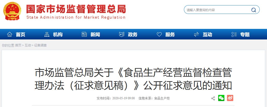 市場監(jiān)管總局征求《食品生產(chǎn)經(jīng)營監(jiān)督檢查管理辦法(征求意見稿)》意見
