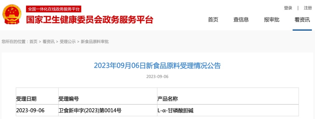 國家衛(wèi)健委發(fā)布L-α-甘磷酸膽堿新食品原料受理公告