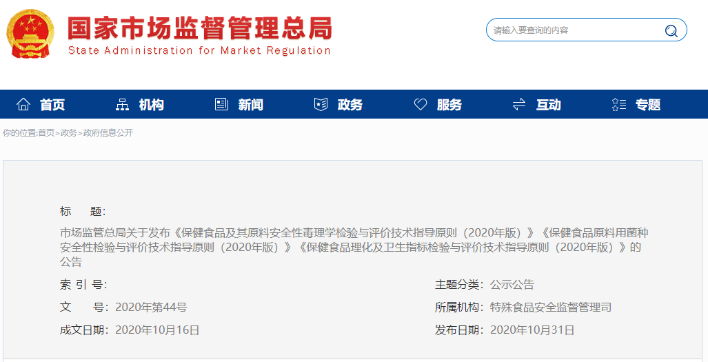 根據(jù)《中華人民共和國食品安全法》,經(jīng)與國家衛(wèi)生健康委協(xié)商一致,市場(chǎng)監(jiān)管總局制定了《保健食品及其原料安全性毒理學(xué)檢驗(yàn)與評(píng)價(jià)技術(shù)指導(dǎo)原則(2020年版)》《保健食品原料用菌種安全性檢驗(yàn)與評(píng)價(jià)技術(shù)指導(dǎo)原則(2020年版)》《保健食品理化及衛(wèi)生指標(biāo)檢驗(yàn)與評(píng)價(jià)技術(shù)指導(dǎo)原則(2020年版)》,現(xiàn)予印發(fā),自公告之日起施行。
