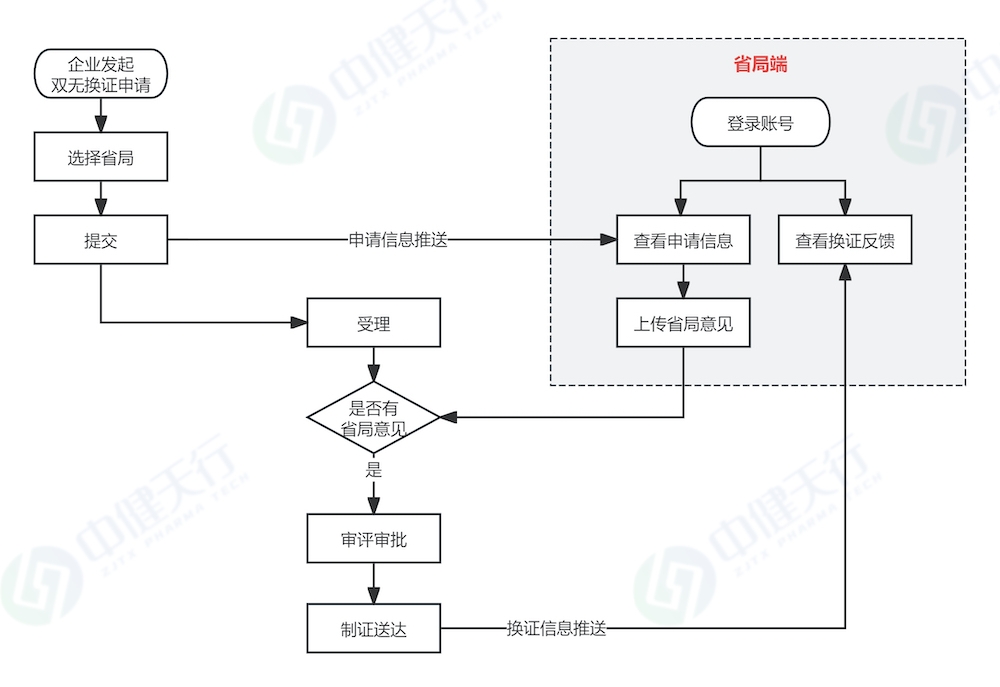 對(duì)于國產(chǎn)“雙無”產(chǎn)品,注冊(cè)申請(qǐng)人應(yīng)提前向核發(fā)生產(chǎn)許可的省局申請(qǐng)《出具換證意見》,待取得省局意見后,再在系統(tǒng)中發(fā)起“雙無”換證申請(qǐng)。但是由于不同省局出具換證意見的工作方案存在差異,申請(qǐng)人需提前了解當(dāng)?shù)鼐唧w要求,具體可參考以下流程:
