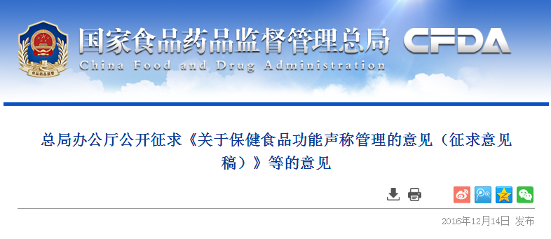 為全面貫徹落實新修訂的《中華人民共和國食品安全法》,進(jìn)一步規(guī)范保健食品功能聲稱,保障消費者權(quán)益,食品藥品監(jiān)管總局研究起草了《關(guān)于保健食品功能聲稱管理的意見》(征求意見稿)以及緩解視疲勞、增強免疫力、抗氧化等3個保健功能的名稱及釋義(征求意見稿),現(xiàn)公開征求修改意見和建議。請社會各界積極參與研究并于2016年12月30日前將相關(guān)意見和建議反饋我局。