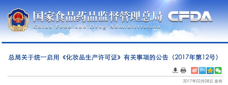 總局關于統(tǒng)一啟用《化妝品生產許可證》有關事項的公告(2017年第12號)