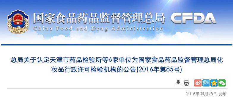 總局關(guān)于認(rèn)定天津市藥品檢驗(yàn)所等6家單位為國(guó)家食品藥品監(jiān)督管理總局化妝品行政許可檢驗(yàn)機(jī)構(gòu)的公告(2016年第85號(hào))