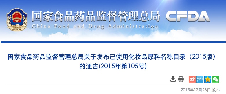 國家食品藥品監(jiān)督管理總局關(guān)于發(fā)布已使用化妝品原料名稱目錄(2015版)的通告(2015年第105號)