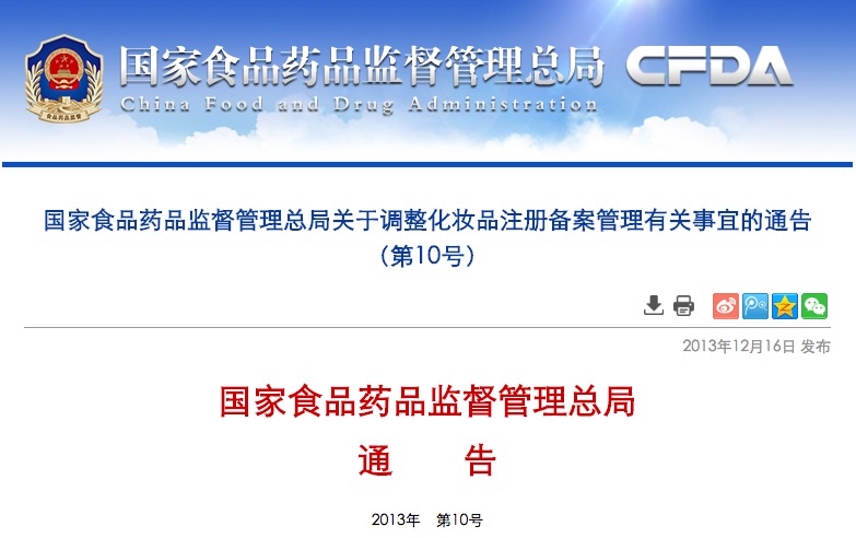國家食品藥品監(jiān)督管理總局關(guān)于調(diào)整化妝品注冊備案管理有關(guān)事宜的通告(第10號)