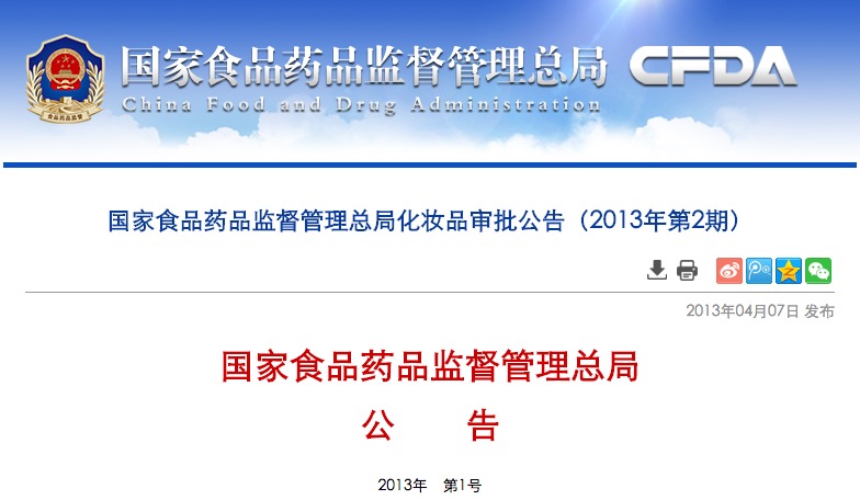 國家食品藥品監(jiān)督管理總局化妝品審批公告(2013年第2期)