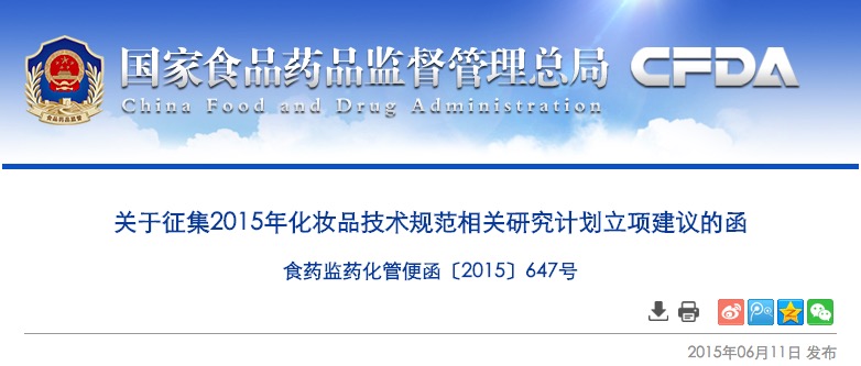 關(guān)于征集2015年化妝品技術(shù)規(guī)范相關(guān)研究計(jì)劃立項(xiàng)建議的函