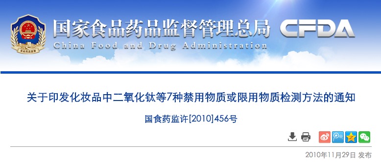 為規(guī)范化妝品中禁用物質(zhì)和限用物質(zhì)檢測(cè)技術(shù)要求,進(jìn)一步提高化妝品衛(wèi)生質(zhì)量安全,化妝品中二氧化鈦等7種禁用物質(zhì)或限用物質(zhì)檢測(cè)方法已經(jīng)國(guó)家食品藥品監(jiān)督管理局化妝品標(biāo)準(zhǔn)專(zhuān)家委員會(huì)審議通過(guò),現(xiàn)予印發(fā)。