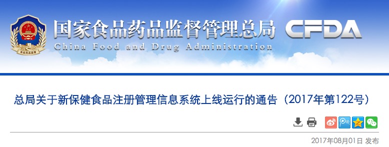 總局關(guān)于新保健食品注冊管理信息系統(tǒng)上線運行的通告(2017年第122號)