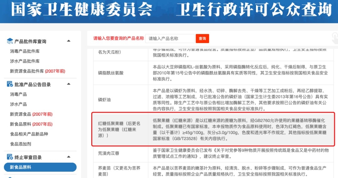 近日,通過(guò)國(guó)家衛(wèi)健委公眾查詢系統(tǒng)得知,新食品原料終止審查目錄中新增“紅糖低聚果糖(后更名為低聚果糖(紅糖來(lái)源))”,截至目前新食品原料終止審查數(shù)量共計(jì)69種。
