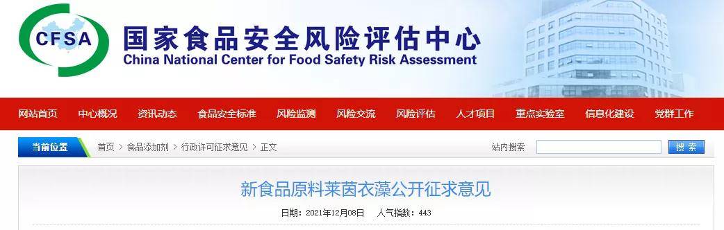 受?chē)?guó)家衛(wèi)生健康委員會(huì)委托,根據(jù)《食品安全法》和《新食品原料安全性審查管理辦法》的規(guī)定,萊茵衣藻申報(bào)新食品原料已通過(guò)專(zhuān)家評(píng)審委員會(huì)技術(shù)審查,現(xiàn)公開(kāi)征求意見(jiàn),請(qǐng)于2022年1月8日前將意見(jiàn)反饋至我中心,逾期將不予處理。
